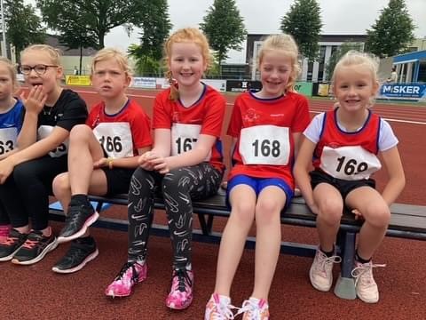Er waren ook trainers mee, dat vond ik fijn. Bij de warming up zag ik Dagmar, Sophie en Eva. Zij zitten ook in mijn groep. Ook waren er grote kinderen die meededen van HAC. Heel gezellig!