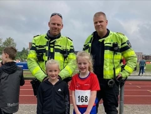 Het allerleukste vond ik dat er twee politieagenten kwamen kijken naar de wedstrijd. Ik mocht zelfs met de agenten op de foto.