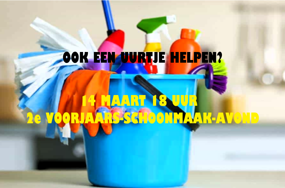 Deze tweede schoonmaakavond is op donderdag 14 maart. Er wordt gestart om 18 uur en we eindigen wanneer alles klaar is.