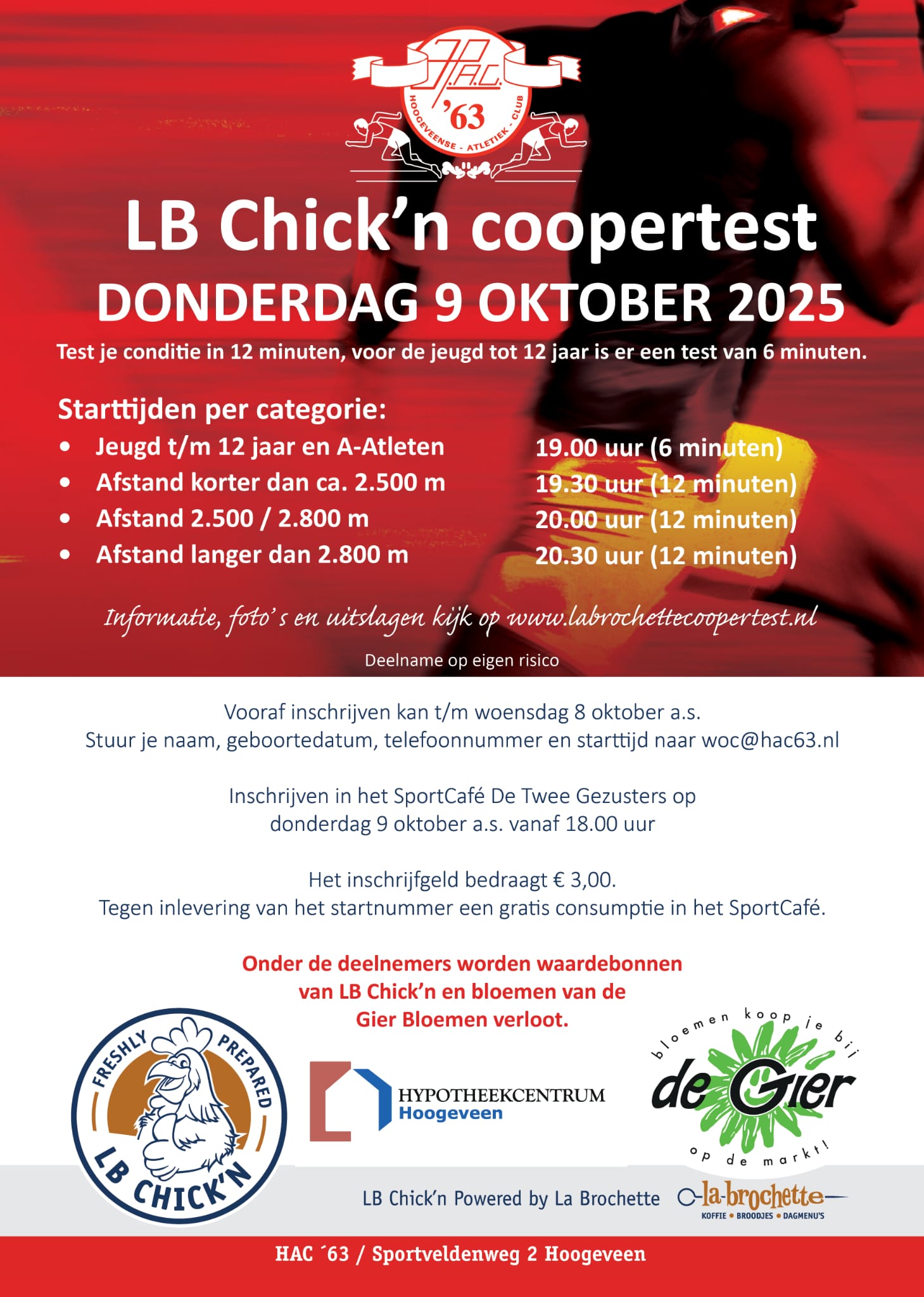 De starttijden zijn ingedeeld op afstand, zodat iedereen op zijn eigen niveau kan deelnemen. Inschrijven kan tot woensdag 8 oktober via woc@hac63.nl, met vermelding van je naam, geboortedatum, telefoonnummer en gewenste starttijd. Op de dag zelf kun je ook nog terecht in SportCafé De Twee Gezusters vanaf 18.00 uur.