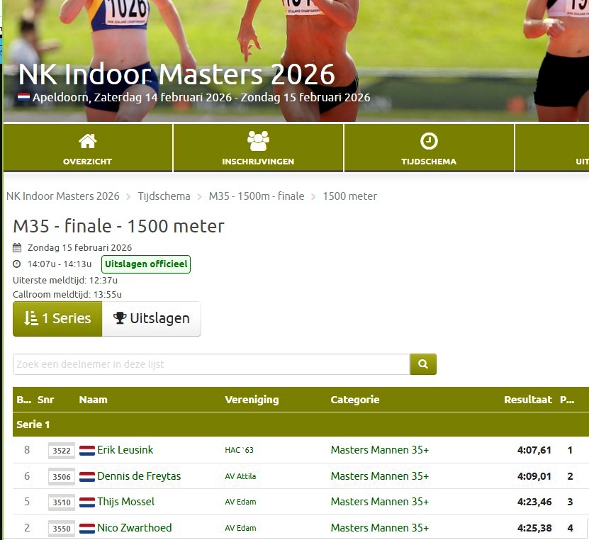 Erik Leusink werd Nederlands Kampioen op de 1500 meter M35+ in een sterke 4:12. Rob van de Graaf veroverde twee keer brons: zowel op de 3000 meter (11:01) als op de 1500 meter (5:13). Foka Koopmans maakte haar debuut op een NK Indoor en pakte meteen een podiumplaats als 2e op de 800 meter in 3:28,69, en werd daarnaast 5e op de 400 meter in 1:33,62.