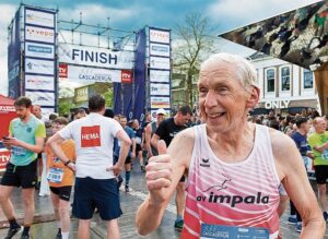 De bijna 70-jarige Chris Draijer uit het Friese Oudega komt juichend over de finish. „Ik heb een persoonlijk record! Ik wilde onder de 1 uur en 9 seconden blijven en dat is gelukt! Ik vond het geweldig.”