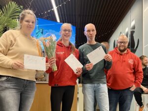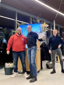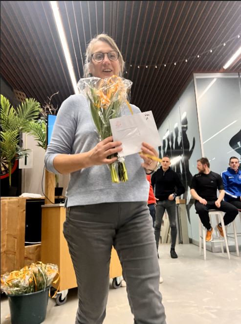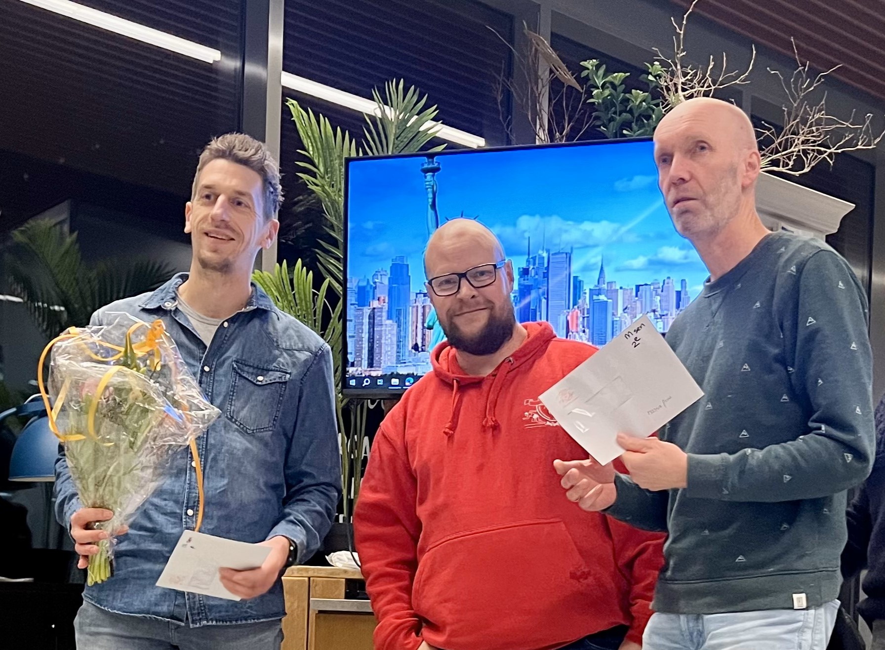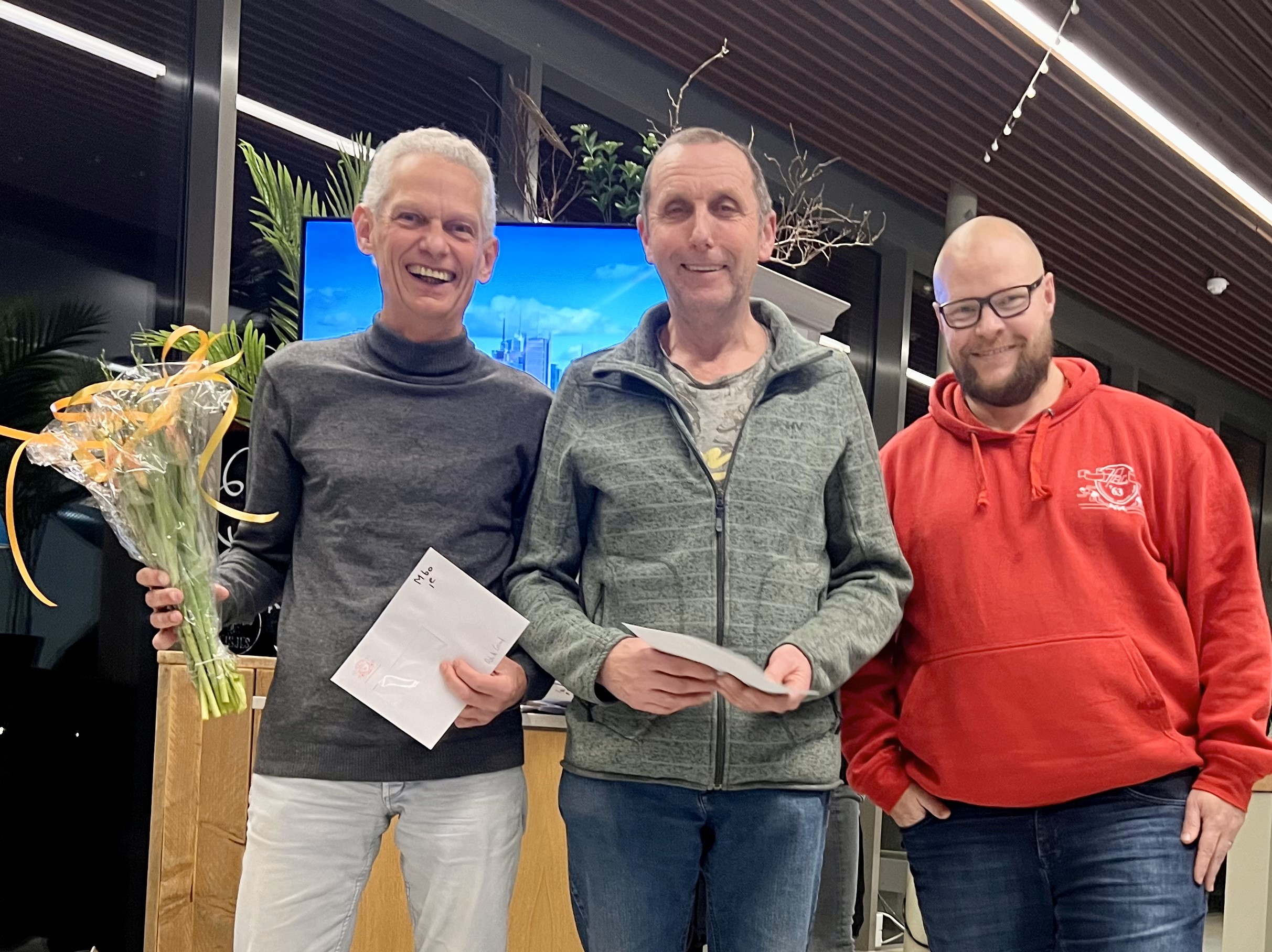 Tijdens de nieuwjaarsreceptie heeft bestuurslid Henri Martens de prijzen van de Hypotheekcentrum competitie uitgereikt: ”de enveloppe met inhoud” en voor de 1e prijswinnaars was er natuurlijk een klein boeketje bij.