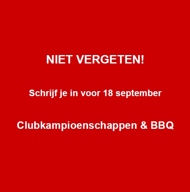 Op 26 en 27 september zijn de clubkampioenschappen met als gezellige afsluiting de BBQ voor alle deelnemers, vrijwilligers, vrienden en familie. Let op: de inschrijvingen sluiten op 18 september.