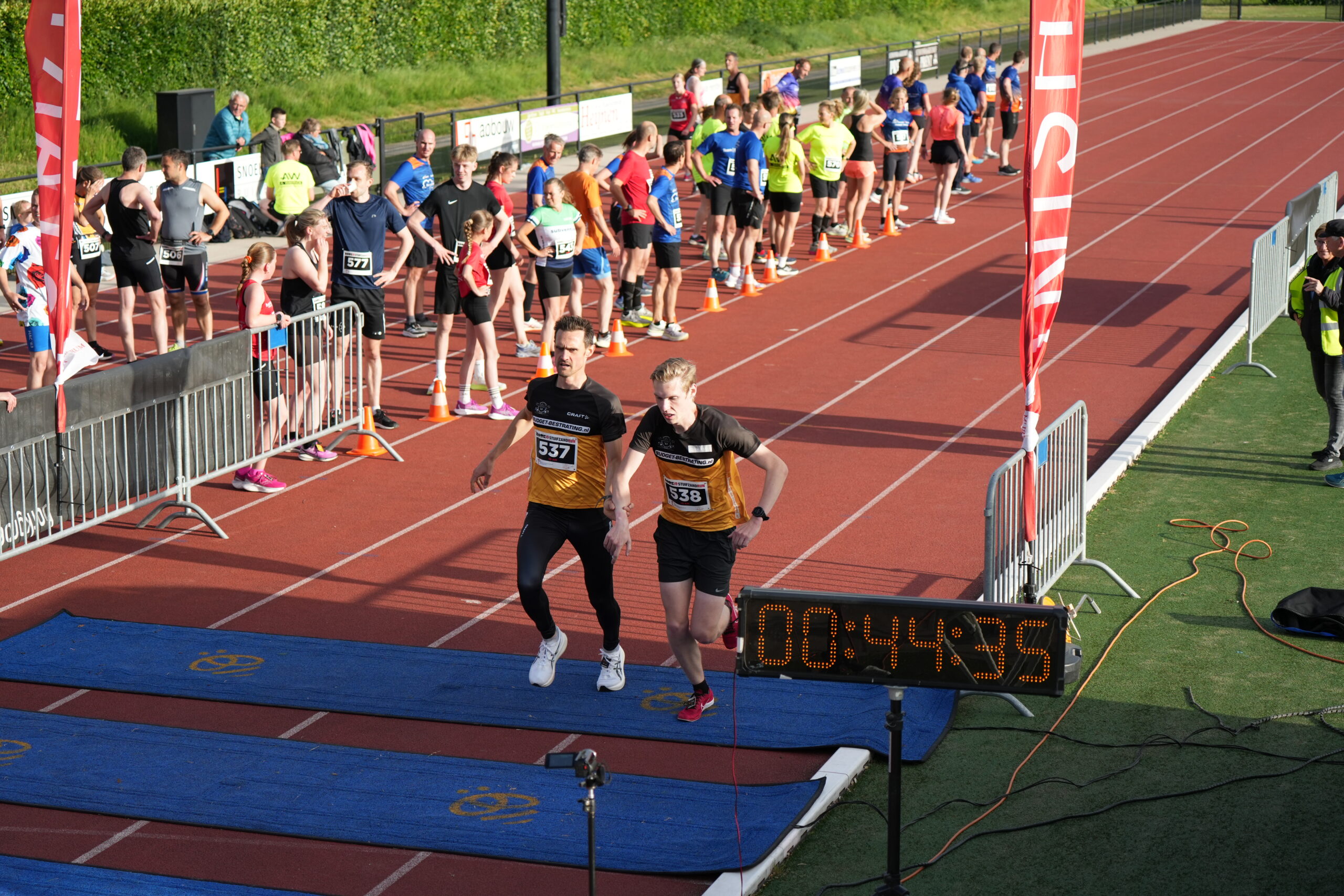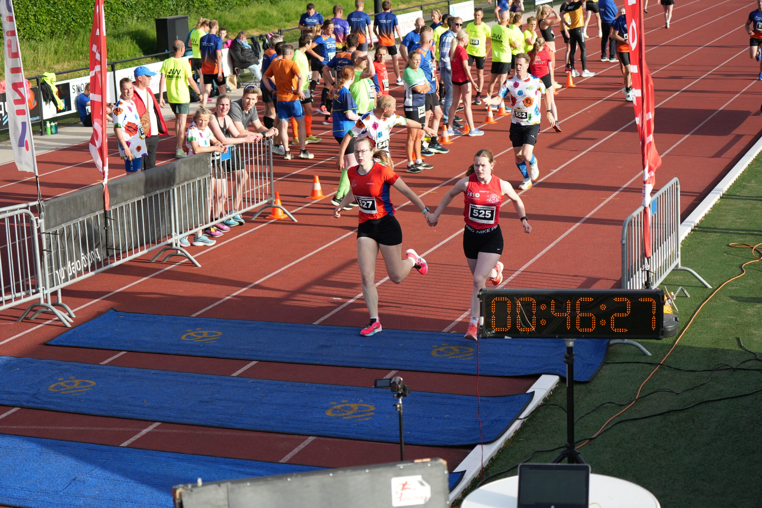 Daarna ging de uursloop van start. Hier stonden naast diverse teams met eigen HAC’63 atleten ook veel teams met atleten uit de regio aan de start. Bij de heren bleef het spannend wie in één uur de meeste kilometers kon volbrengen. De snelle atleten van HAC’63 – lopende in team Budget-Bestrating.nl- streden kop aan kop met team Bram 1-1 uit Grou. HAC’63 atleten Harm-Jan Martens, Gert-Jan Stevens, Jeff Poelman en Marnix Prins (team Budget-Bestrating.nl) gingen tot het uiterste voor de winst, maar team Bram 1-1 wist in een uur nipt 2 meter meer af te leggen. De derde plaats bij de heren was voor het tweede team van AV Bram. Bij de dames was het team van AAC’61 een maatje te groot voor de HAC’63 dames die uitkwamen voor team Out of Control. Derde werd het damesteam van Bram 1-1 uit Grou. De Ladies in Red, bestaande uit jeugdatleten van HAC’63, streden lang mee om een derde plek, maar uiteindelijk was een uur best lang voor deze nog jonge meiden. Ze wisten wel knap meer dan 16 km in een uur afteleggen! Team de Snelle Rakkers, met de A-Atleten van HAC’63; bestaande uit Jorian, Berend-Jan, hun trainster Alida en begeleider Ronald hadden zelfs geoefend om de wissels goed te laten verlopen. Zij liepen in een uur maar liefst meer dan 35 ronden (bijna 14km). Deze Snelle Rakkers wisten een mooie strijd neer te zetten met het team de Supporters. Een sportieve en knappe prestatie van deze supporter-ouders (van de HAC’63 loopsters) van team Ladies in Red. Ook de overige teams met atleten van HAC’63 waaronder Vier Versnellingen en de Vredeveldjes, stonden niet op het podium maar gingen samen tot het uiterste om zoveel mogelijk ronden in een uur te volbrengen.